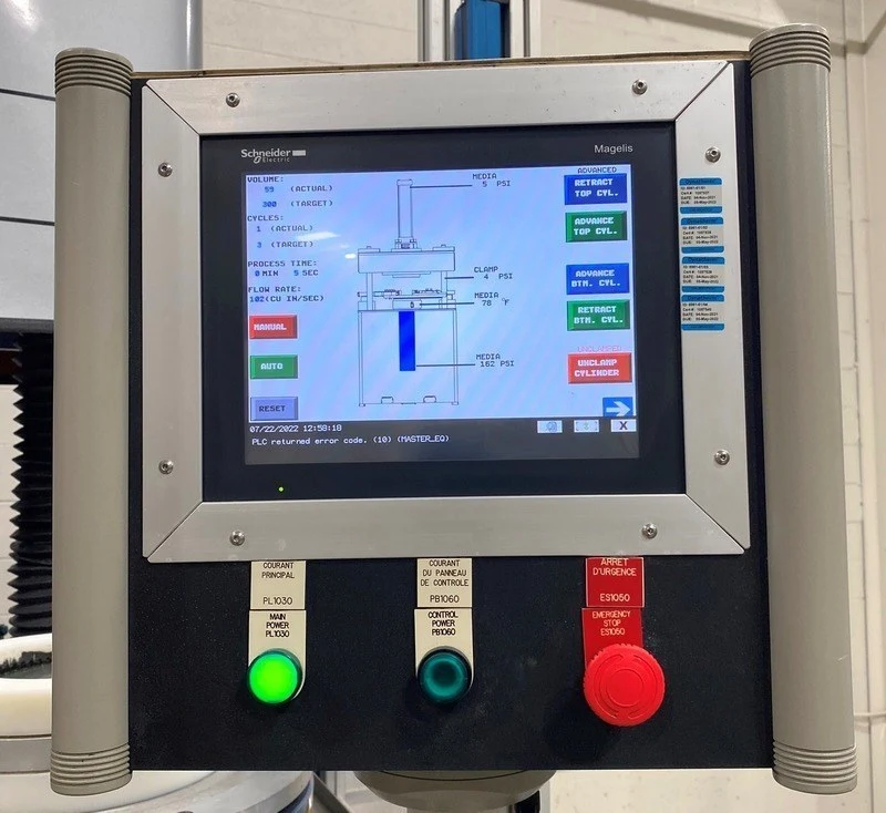 Extrude Hone Spectrum 10/8/8, 10″ Media Cyl Dia, 8″ Hyd Cyl Dia, 1200 PSI Extrusion Pressure, PLC, ’05
