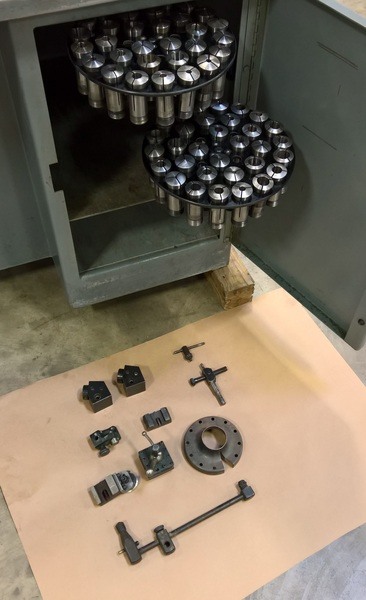Assorted Collets, 6″ 3-Jaw Chuck, Cut-Off Slide, Tool Posts