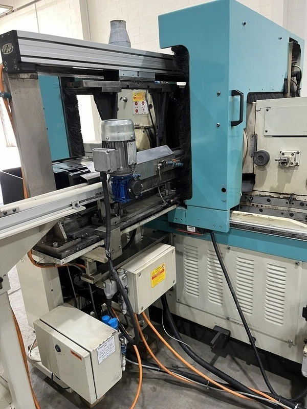 Elevating Hopper Loader, CNC axis controlled Gantry Parts Handler with fingers. Loader rolls the part down to fingers which act as guides. Overhead gantry moves part between wheels (reciprocates/oscillates at a programmed speed) Regulating wheel creeps in & out.