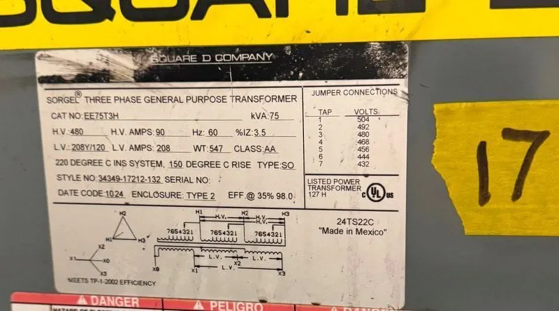 Square D EE75T3H, 75kVA, 480V Primary, 208/120V Secondary, 3 Phase, Dry Type, (2)