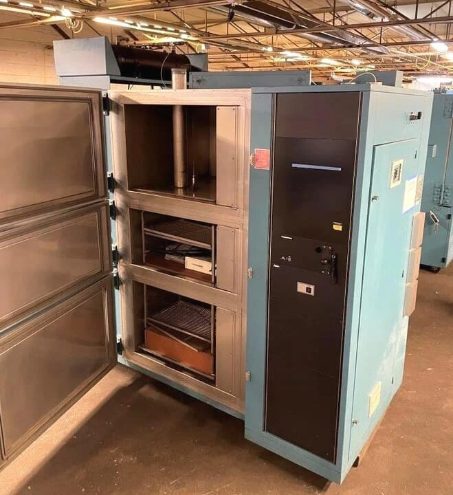 Thermotron thermal shock chamber Double Duty model ATS-320-DD has a cold zone positioned between two hot zones, aligned vertically top and bottom. Products under test are placed in one of two product carriers and transferred between the zones producing severe thermal stress. At least one product carrier always occupies the cold zone.