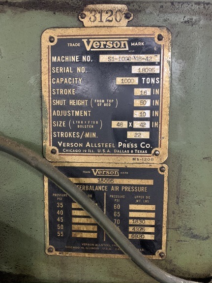 1000 Ton Press – Verson S1-100-48-42 SSDC SPECIFICATIONS: